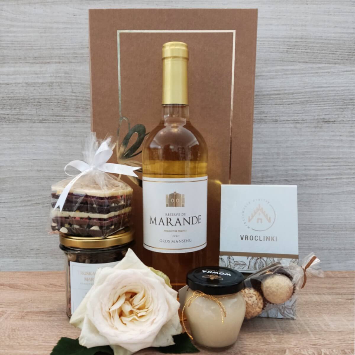 - ELEGANCKIE JASNO BRĄZOWE PUDEŁKO PREZENTOWE Z WYPEŁNIENIEM GOTOWE DO WRĘCZENIA o wymiarach 36 cm x 20 cm x 10 cm